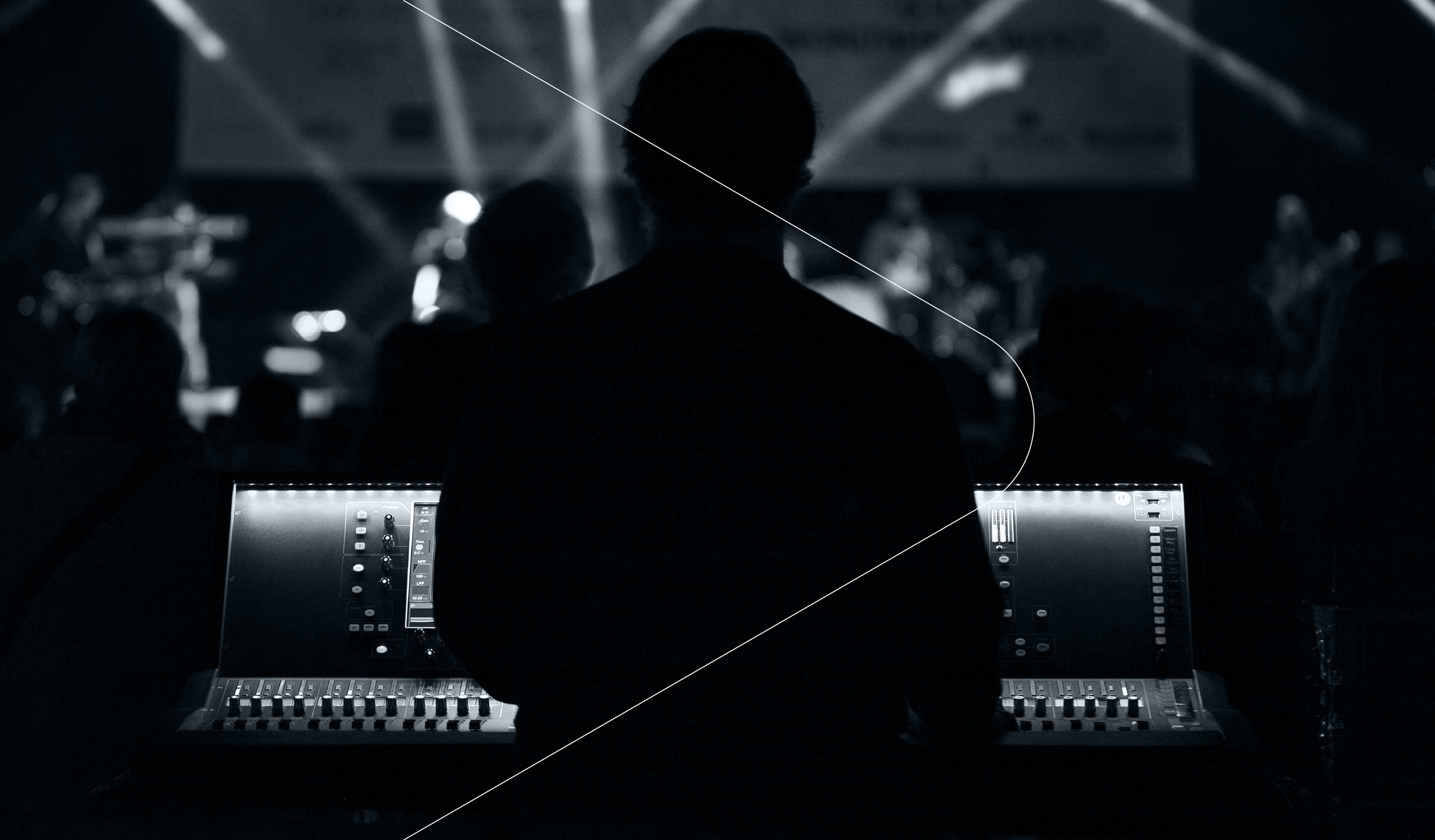Their silhouettes stand in stark contrast against the vibrant, colorful stage lights in the background, symbolizing how their presence shapes every moment of the performance despite remaining unseen.